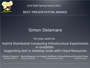 Research in Grids - Production Grids workshop held October 13th, 2009L’Institut des Grilles (IdG) et l’action Aladdin INRIA lancent un appel commun à propositions pour dynamiser les recherches à l’interface entre la recherche sur les grilles, les grilles de recherche, et les grilles de production. Le colloque présentera les questions ouvertes aux interfaces et les projets proposés dans le cadre de cet appel, afin de favoriser la création de nouveaux réseaux. Le but de la journée est de faire émerger des synergies. La présentation de travaux en cours est donc vivement encouragée. Plus d’informations. Grid'5000 Spring School 2010 announced (online or offline Registrations now opened)Organized in Lille, from April 6th to April 9th 2010, this spring school will bring together, but is not limited to, Grid'5000's users, technical team and executive committee for 4 days of tutorials and talks focusing on best-practices and results. Presentations and practical sessions will cover both basic usage of the platform, for new users, or potential users of Grid'5000 and advanced and new usage of the platform, for current users. A challenge to showcase tools and environments demonstrating the deployment of distributed or Grid middleware on Grid'5000 will be held this year for the first time. (image ©-maxime-dufour-photographies) Research in Grids - Production Grids workshop held October 13th, 2009L’Institut des Grilles (IdG) et l’action Aladdin INRIA lancent un appel commun à propositions pour dynamiser les recherches à l’interface entre la recherche sur les grilles, les grilles de recherche, et les grilles de production. Le colloque présentera les questions ouvertes aux interfaces et les projets proposés dans le cadre de cet appel, afin de favoriser la création de nouveaux réseaux. Le but de la journée est de faire émerger des synergies. La présentation de travaux en cours est donc vivement encouragée. Plus d’informations. --- Supercomputing and grid computing days at LilleThe first edition of the supercomputing and grid computing days at Lille will be held at Université de Lille1 and INRIA Lille - Nord Europe on December 2, 3 and 7, 2009. Half of the event is dedicated to the Grid5000 nation-wide grid infrastructure. A series of presentations including feedbacks on the use of Grid5000 is scheduled together with a one day practical training on it. The detailed program is available at: http://www2.lifl.fr/~melab/pmwiki/index.php?n=Main.Journ%e9esCIGIL --- Research in Grids - Production Grids workshop held October 13th, 2009L’Institut des Grilles (IdG) et l’action Aladdin INRIA lancent un appel commun à propositions pour dynamiser les recherches à l’interface entre la recherche sur les grilles, les grilles de recherche, et les grilles de production. Le colloque présentera les questions ouvertes aux interfaces et les projets proposés dans le cadre de cet appel, afin de favoriser la création de nouveaux réseaux. Le but de la journée est de faire émerger des synergies. La présentation de travaux en cours est donc vivement encouragée. Plus d’informations. Grid'5000 Tutorial at CLCAR 2009 in VenezuelaYiannis Georgiou will present a Grid5000 tutorial at the 2nd edition of Latin American Conference on High Performance Computing (CLCAR) held in Merida, Venezuela (21-25 September 2009). Best Student Demo Award given to Grid'5000 users at Sigmetrics/Performance 2009 at SeattleThis award was given to Patrick Loiseau, Romaric Guillier, Oana Goga, Matthieu Imbert, Paulo Goncalves, Pascale Vicat-Blanc Primet (INRIA, ENS-Lyon, University of Lyon, France) for their demo Automated Traffic Measurements and Analysis in Grid'5000 demo at the demo session Grid'5000 under extension to Porto Alegre, BrazilJuly 21st, 2009, INRIA and UFRGS signed a Memorandum of Understanding marking the cooperation of the two institutes towards the extension of the Grid'5000 platform to Brazil. According to the terms of this memo, UFRGS will contribute to Grid'5000 by operating a local site in Porto Alegre and INRIA will fully integrate this local site into Grid'5000 in order to gain an international scale. Researchers from both partners will therefore gain access to one of the major scientific instruments for the study of large-scale parallel and distributed problems in computer science. With this cooperation, Grid'5000 gives its users the possibility to study the effects of inter-continental networks links on these problems. For Grid'5000 users, access to the new site during the integration phase is possible using portoalegre.grenoble as name of the new site Grid'5000 showcased during the Open Days of Bell Labs FranceJune 2nd, 2009, MEtroflux/NXE tools where shown using Grid'5000 during a week during the Open Days of Bell Labs France, demonstrating the potential of Grid'5000 as a research instrument. Second Grid'5000 award given to Lucas NussbaumDuring Grid'5000 Spring School 2009, Lucas Nussbaum was given the second Grid'5000 award, in recognition of his outstanding contribution to ALADDIN / Grid'5000. Grid'5000 spring school now finishedThe Grid'5000 spring school took place between April 7, 2009 and April 10, 2009 in Nancy. The presentation program is updated with the slides of the presentations as they come in. Most practical sessions are available to people that did not take part during the school. Here and there (pdf) you can read local press coverage. In addition to the second Grid'5000 award given to Lucas Nussbaum for his outsanding contribution to Grid'5000, 3 awards were given for presentation made during the event :